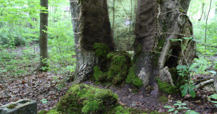 Installation of burlap, wooden stumps, cinder blocks, and moss